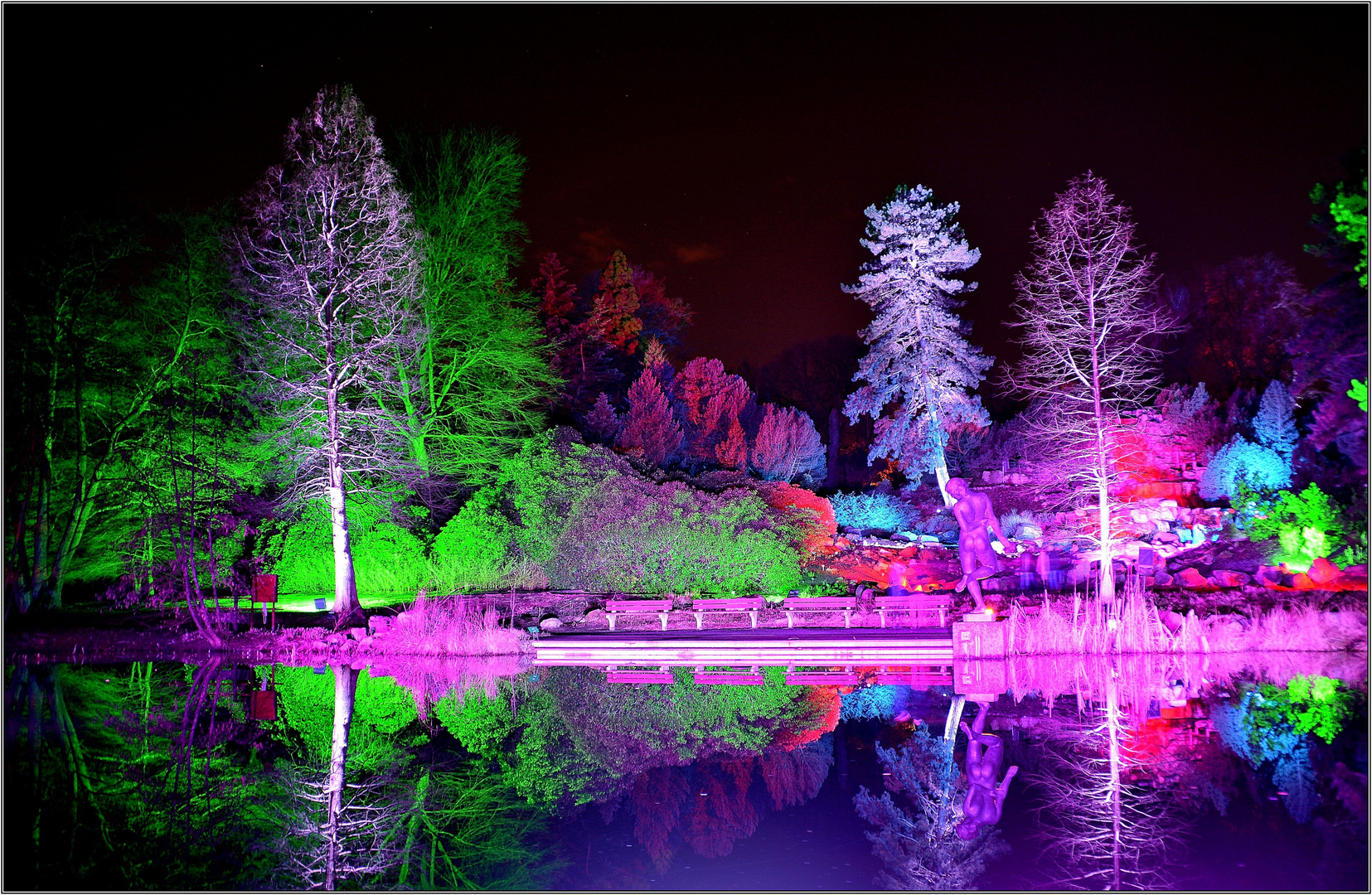 Beim Parkleuchten in der Gruga , Park zwischen haupteingang, farbenterrassen, kranichwiese, bis in den botanischen garten und die mustergärten.